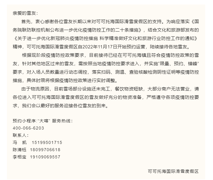 11月16日通知:關于可可托海國際滑雪度假區(qū)預約運營的通告